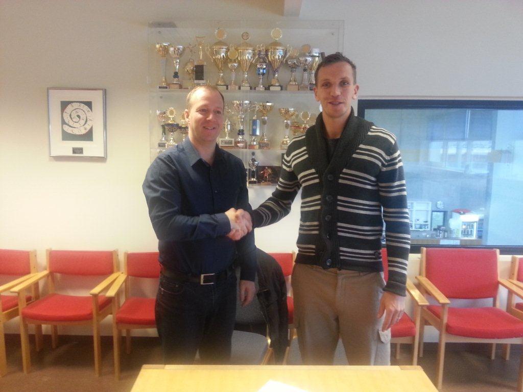 Alli skrifaði undir nýjan tveggja ára samning við félagið í dag. Þetta eru ánægjulegar fréttir enda náið liðið frábærum árangri í sumar og mun spila í 2. deild næsta sumar. Einnig mun hann sjá um þjálfun 3. flokks karla og kvenna. Á meðfylgjandi mynd má sjá Össa og Alla takast í hendur eftir undirritun samningsins.