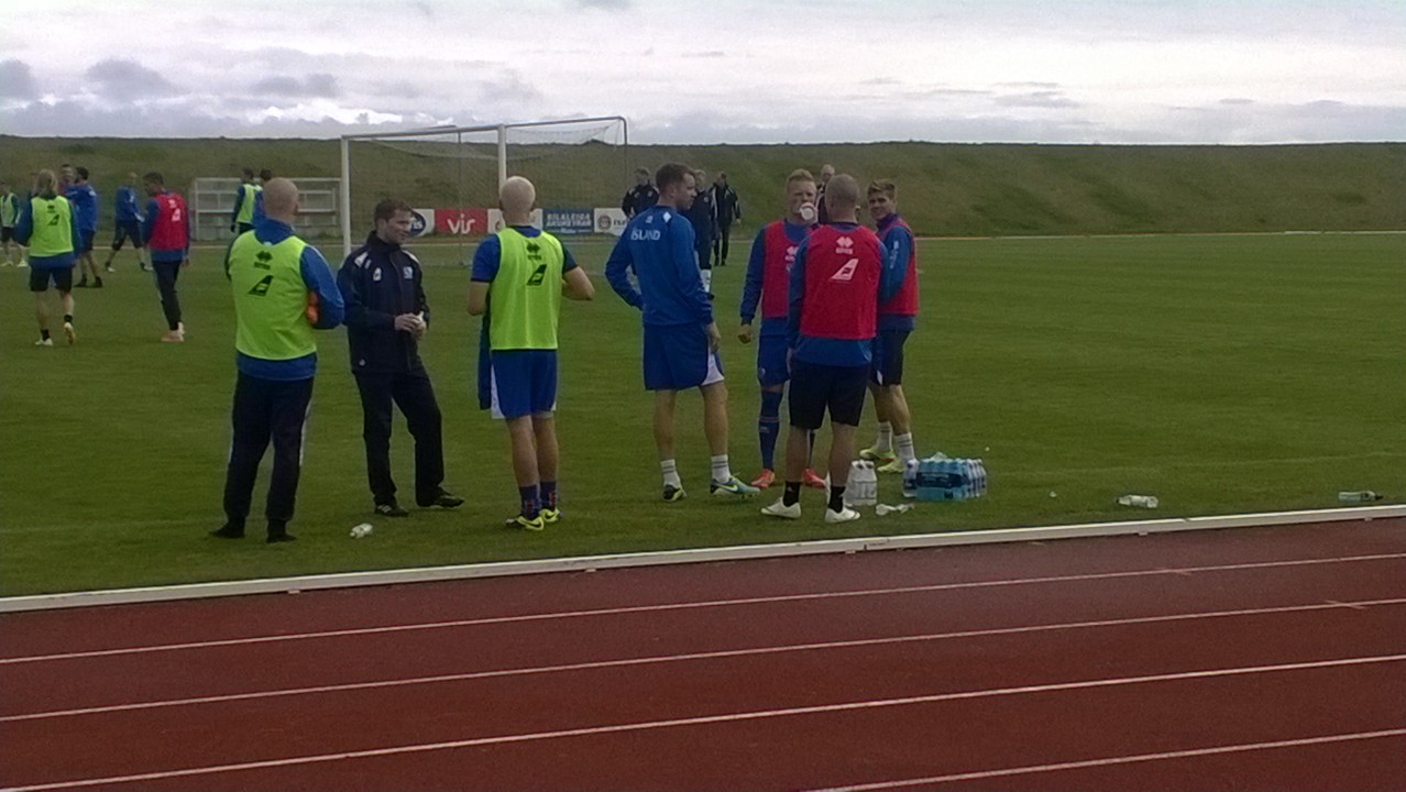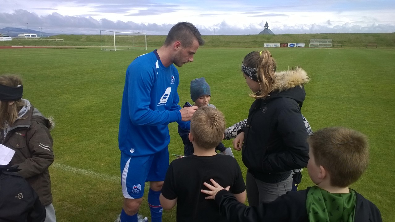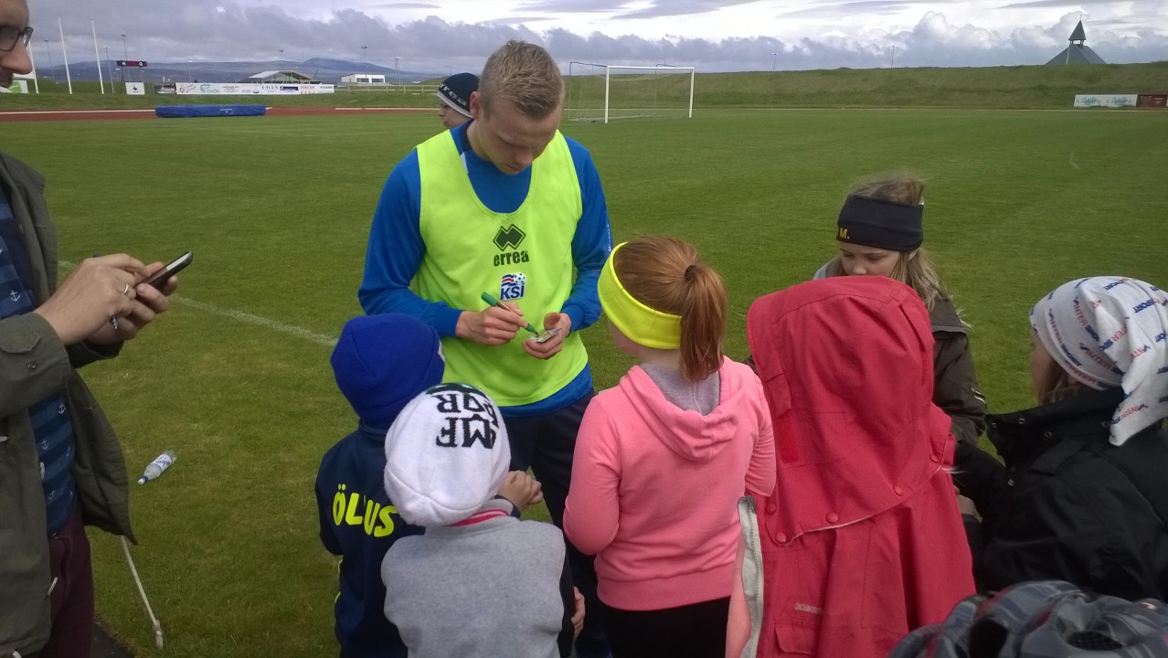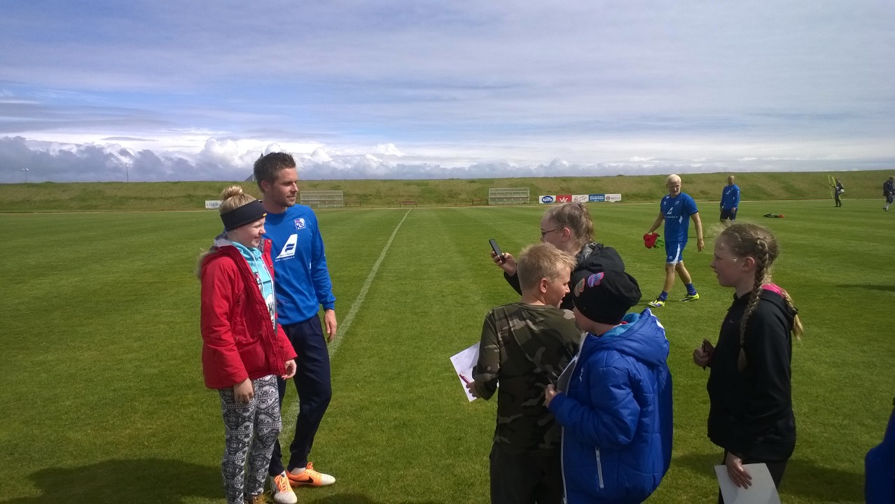 A-landslið karla æfði á Þorlákshafnarvelli við frábærar aðstæður í dag. Talsverður fjöldi fólks mætti til að fylgjast með liðinu og voru yngri iðkendur Ægis þar engin undantekning. Landsliðshetjurnar höfðu nóg að gera við að gefa eiginhandaráritanir og gáfu sér góðan tíma til þess eins og meðfylgjandi myndir sína.