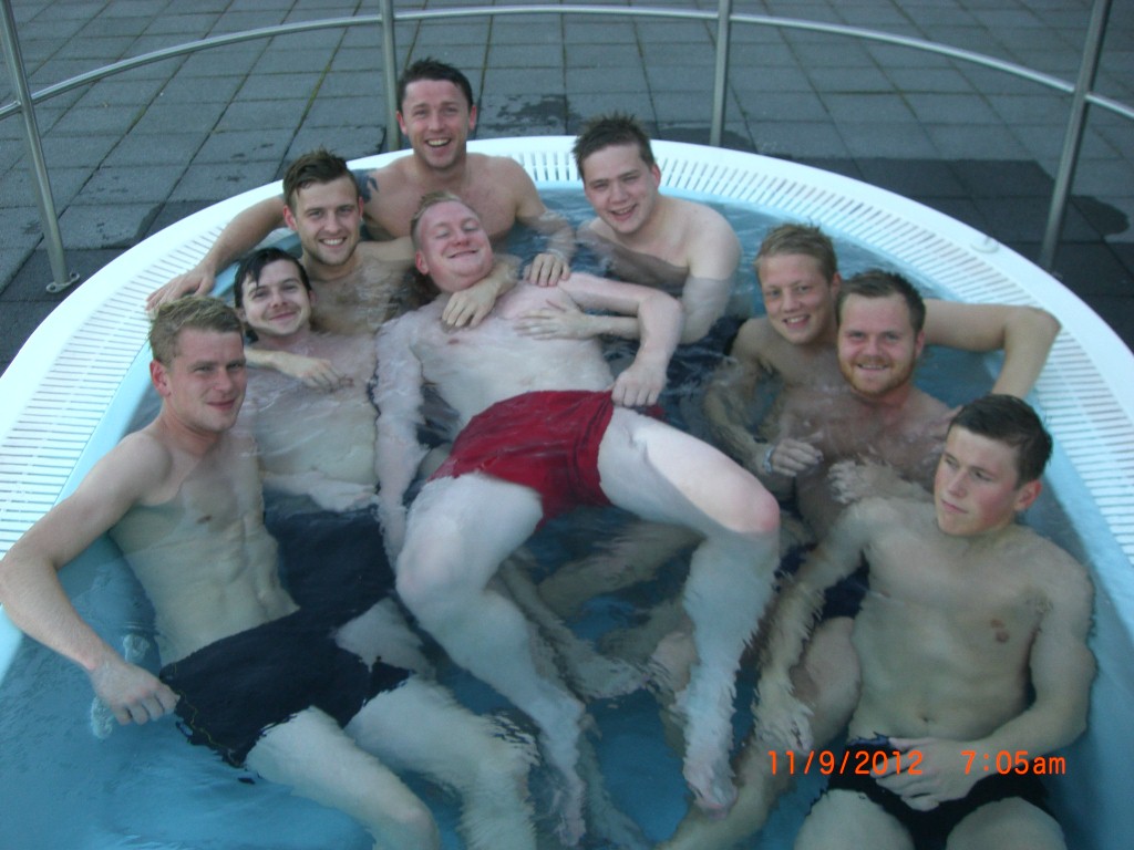 Strákarnir í meistaraflokk slökuðu á í pottinum eftir létta æfingu í kvöld. Á morgun kl. 16:00 er stærsti leikur félagsins í mörg ár þegar liðið mætir Magna í undanúrslitum 3. deildar. Fyrri leikurinn á Grenivík lauk með 3:1 sigri okkar manna. Við erum því í ansi góðri stöðu en ekki má vanmeta andstæðinginn sem vann sinn riðil í sumar.